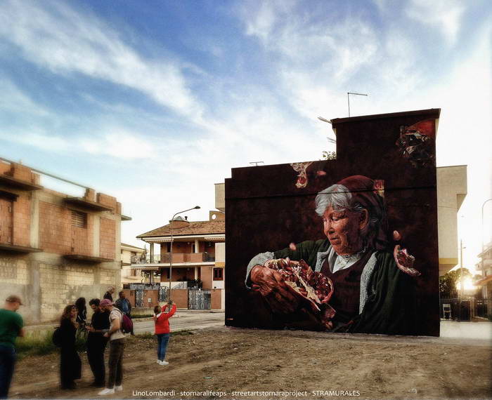 L'artista tedesca Hera ci ha regalato questo suo piccolo intervento in un muro da lei stessa scelto e che non ha voluto fosse ristrutturato. Oltre alla ragazza si notano riferimenti a ciò che sta attorno a lei: la torre campanaria di Stornara, un ripetitore ecc. Anche un paese trascurato può apparire bello se lo si ama.