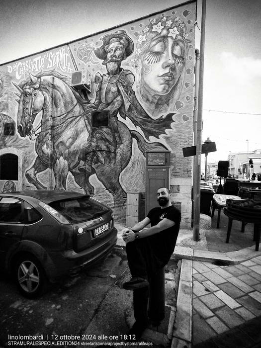 Il murale di Toni Espinar è stato dedicato dall'artista alla nostra associazione. Nel corso degli anni vari sono stati i problemi da noi incontrati e sempre superati. Nella letteratura mondiale Don Chisciotte rappresenta il lottatore per antonomasia. Così come Stornara Life secondo Espinar è un'associazione di combattenti. Al centro del murale troneggia Don Chisciotte a cavallo: si nota subito nel suo petto la S logo di STRAMURALES. Il cavallo è un cavallo magico con tanti occhi perché l'artista ritiene che la realtà va vista attentamente. A fianco al cavaliere l'amata Dulcimea. Guardando il murale dalla parte sinistra, in alto si vedono sei belve feroci che litigano tra di loro: secondo Espinar sono i vari imperialismi che litigando fanno cadere missili, bombe ed escrementi sulla popolazione rimanendo loro indenni. In basso, sotto di loro, si vedono infatti due scheletri. Un adulto morto domandandosi perché e un bimbo che lo guarda ancora con amore. In alto nell'estrema sinistra Toni ha dipinto una piccola navicella spaziale come se degli extraterrestri si guardassero bene dal rimanere sulla Terra. La loro venuta è testimoniata dalla presenza del robot di Guerre Stellari.